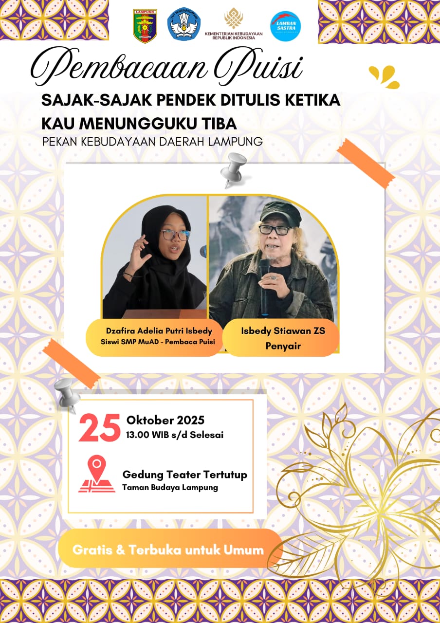 Penyair yang dijuluki Paus Sastra Lampung oleh HB Jassin ini akan berkolaborasi dengan putrinya, siswi kelas 9 SMP Muhammadiyah Ahmad Dahlan (SMP MuAD) Kota Metro, Lampung. Keduanya akan membacakan puisi “Sajak Sajak Pendek Ditulis Ketika Kau Menungguku Tiba” — sebuah puisi dalam 11 bagian, dan satu puisi pendek “Aku Hanya Menunggu”.