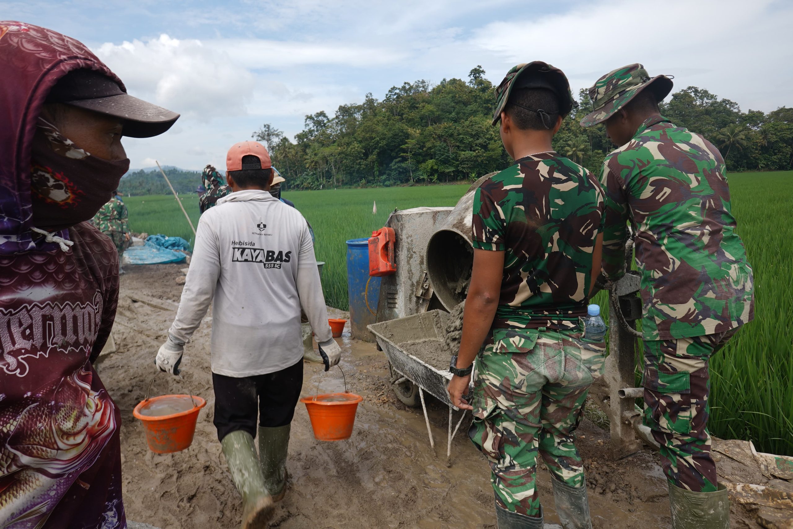 Dengan menggunakan angkong, anggota satgas dapat mengangkut material bangunan dengan lebih mudah dan cepat, meskipun cuaca hujan. Sementara itu, ember digunakan untuk mengangkut air dan material lainnya, sehingga pekerjaan dapat terus berjalan lancar.